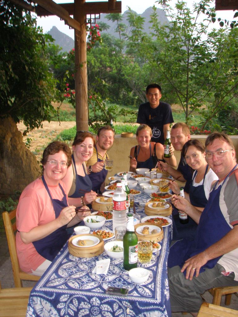 Another highly recommended activity in the area was the Yangshuo Cooking School. We started with a short visit to a local market to get fresh produce and to be shown around the meat area (dog section optional). Then, out into the countryside to a well-equipped classroom where we had individual cooking areas to try to replicate the demonstrated dishes, including the local speciality, beer fish Pijiu Yu. We sat as a group to enjoy the feast we had prepared, in an open-sided building to best appreciate the beautiful surroundings, with a backdrop of the dramatic karst mountains.