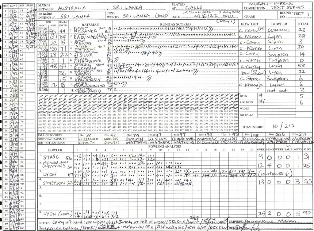 Last session extended half an hour due to poor run rate. End of the day’s play Sri Lanka 10/212, Australia 3/98; enjoyed watching 13 wickets fall on day one.