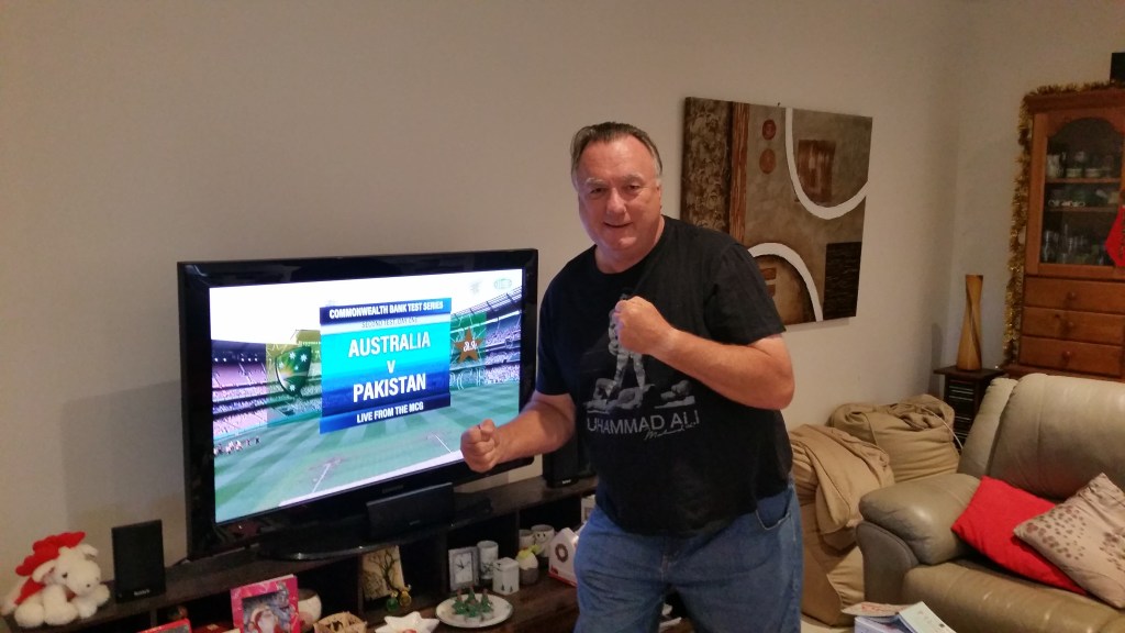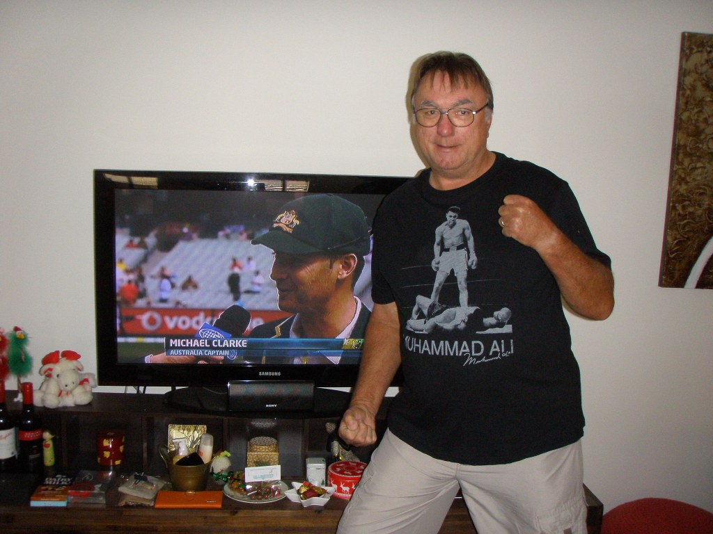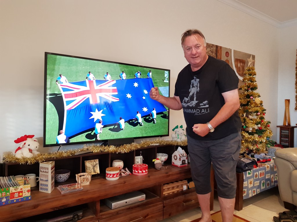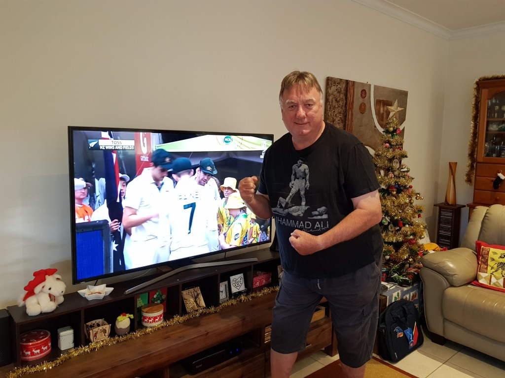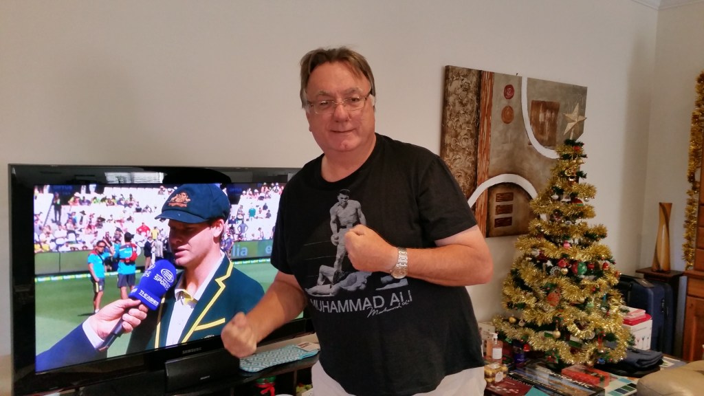 For Tom, it’s also a link to boxing and to one of his heroes. A tradition started in 2012 with a new Muhammed Ali T-shirt. What better time to wear it than on Boxing Day! An excuse to put on the T-shirt and pose at the start of the cricket.
