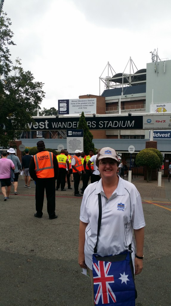 Enjoyed our very good seats in line with the pitch. Mostly South African flags around, but also some fellow Australian supporters. Some of the folk from our usual tour group were sitting just around from us, so a chance to catch up for a chat.
