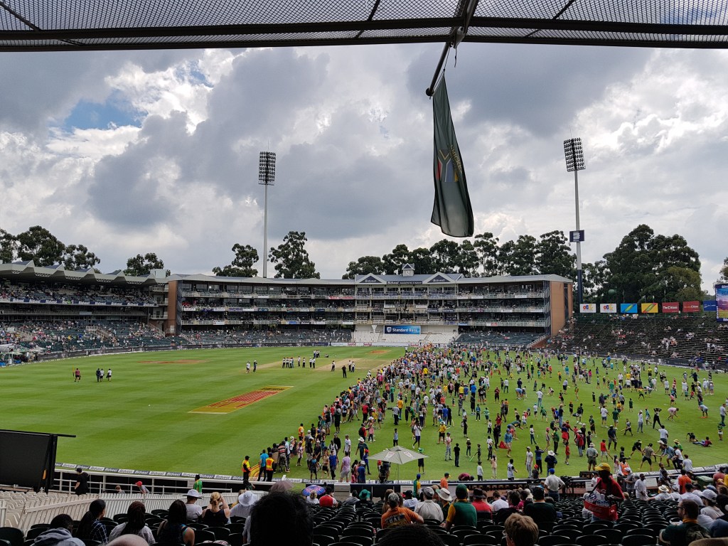As part of our personal trip to South Africa (not part of a tour group this time), we had a brief stay in Johannesburg. We went to only one day of the cricket (the second day of the 4th test match), sandwiched in between amazing safari holidays in Moditlo River Lodge, near Kruger National Park, and Thebe River Safaris, Botswana (see Ouch on Safari and Breakfast).