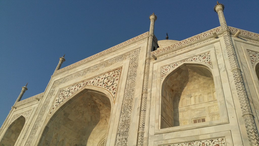 One of those mornings where you keep waking up every hour to see if it is 5am yet. Up early to meet at 5:45am for the “sunrise tour” of the Taj Mahal. Only a 5-minute drive from the hotel. Recommended to only take cameras for the security checks, and to wear long trousers/sleeves for modesty. In the queue soon after 6am, after successfully dodging all the animal poo along the footpath in the pre-dawn light.